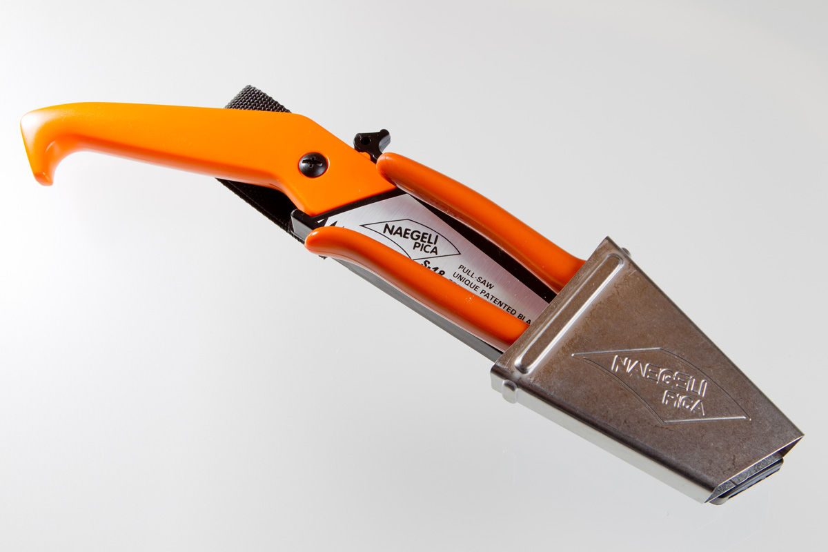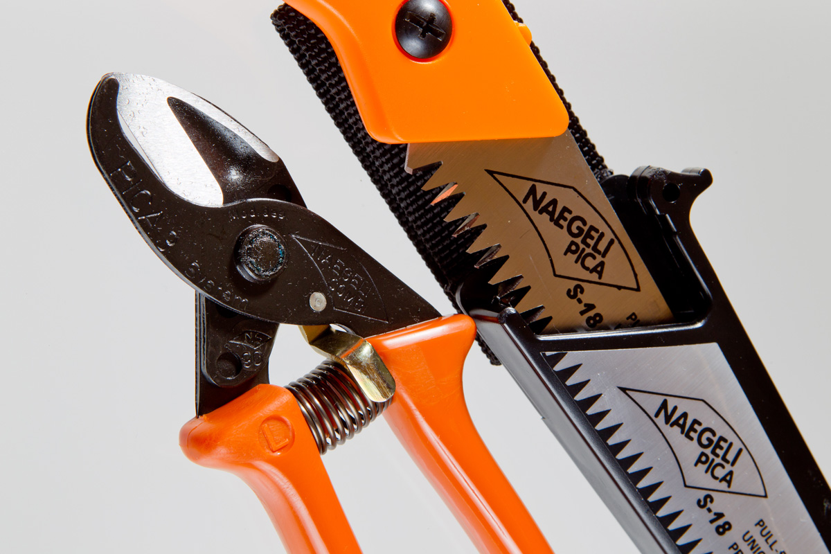 Das geringe Gewicht von Säge und Schere erlaubt die Kombination von zwei bewährten Werkzeugen, die im praktischen Gebrauch abwechselnd benutzt werden. Das arbeitsgerechte Schnitt-Set hängt "coltartig" am Gürtel und ermöglicht dadurch eine grosse Handfreiheit beim Arbeiten.